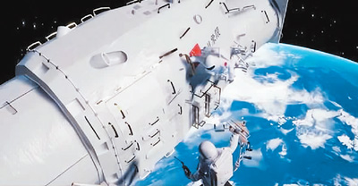 航天员从天宫空间站出舱开展巡天空间望远镜维护作业示意图。