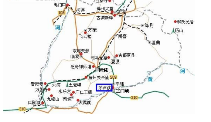 在黄河北岸的山西省境内,从上流到下流,相继有风陵渡、大禹渡和茅津渡三大著名渡口。自古到今,为晋陕豫的交通要冲和军事重地,地理位置十分重要。