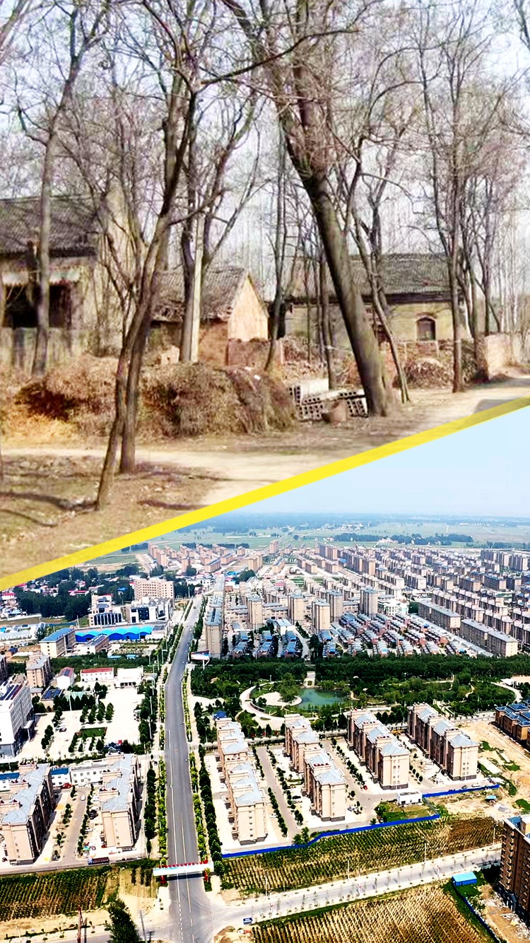 封丘县李庄镇黄河滩区搬迁前后。(搬迁前的图片由封丘县李庄镇提供,搬迁后的图片 孟庆军摄)